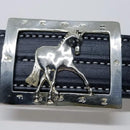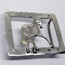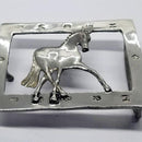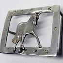 Another new buckle with the popular Half Pass Horse. This combo is the large dressage arena with all the letters in place, and the horse in a Half Pass movement, floating accross the center. The horse has space all around him which allows the leather color of the belt to show through. HIs legs are crossing over in diagonal pairs, with his tail swishing gracefully, He dons a braided mane and very pleasant demeanor. This low profile buckle measures 2 5/8 inch wide x 2 inches tall and fits a 1.5 inch leather belt. A smaller version is forthcoing that will fit the 1.25 inch wide belt.