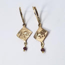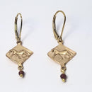A very sweet Horse earring with the offset squared shape. This design features and Extended Trot Horse as a very small earring. The squared piece is 3/8 inch wide, and 1 1/2 inch tall overall with the lever back and garnet bead drop. The horse is a raised relief which began as a buckle design. Shown in Rose Bronze. Also available in sterling Silver.