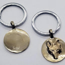 Our ever popular Fox Mask in a simple round with fur detail and those eye watching you! Measures 1 inch round and 2 1/2 inches overall with a steel split ring. There is room on the back to engrave if you like. Tempi can do this for you, or a local engraver.
