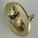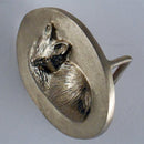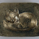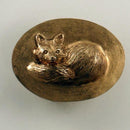 Fox Sleeping Buckle, Rectangle or Oval. This design has our "sleeping fox" in 3D watching you closely! He has fur detail, is curled up with his fluffy tail keeping him warm. This buckle measures 1 3/4 inch wide x 1 3/8 inch tall. Fits a 1 1/4 inch leather belt. There are no sharp parts to catch or hurt you. Does a fox ever really sleep?? You will see this same fox in many offerings at Tempi Design. It is a favored design.