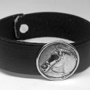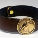 Hunter Horse on Leather Cuff Bracelet Hunter Horsehead profile slide on a leather cuff bracelet. Shown in Rose Bronze, this design has a sweet face, bridle detail, and braided mane. Fits on our 3/4 inch wide leather bracelet. This design measures 7/8 inch round. Cuff has a button stud closure. The average fit is 7 inches. Please add a note to the cart if you need a different size. Also available in Sterling silver. A brown leather cuff is paired with the Rose Bronze. A black leather cuff is paired with sterling silver.