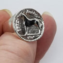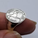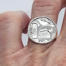 Irish Coin Ring This coin ring is the Irish 20P [which size is 35millimeters round] in a smaller version measuring 3/4 inch across. Lovely and sizeble piece, the ring sizes available are 7, 8. 9, 10, 11, 12 Sterling Silver. If you would like 14k, please email and Tempi will send you a quote.
