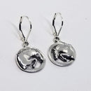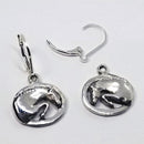 Our newest earrings sporting the Jumping Horse. In a right and left facing set, this horse is reaching forward with a very extended neck and knees tucked high for the upcoming jump. This raised profile sits on a oval cut out for a nicely balanced and lightweight earring. The oval measures 1/2 inch tall x 5/8 inch wide and 1 1/4 inch tall overall with the lever back. This is another design in the series of the Jumper Profile on an Oval. Buckle. Shown in sterling silver..... I will re shoot these photos for a better close up....