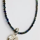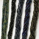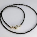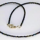 Spinel Bead Necklaces 1 Strand Our most popular alternative for a letter neck cord. Just enough sparkle and color to dress up a simple pendant. These 2-2.5 millimeter stones have an ultra-sparkle and are strung on a Beadalon Wire [ Trademark name ]. Ends are crimped and have a crimp cover, sterling findings, and a lobster claw clasp. These are very very durable necklaces. 16 or 18 inches in length available. Looks best with a medium or small pendant. Sterling Silver or Gold over Sterling findings. Hugely popular!!