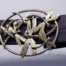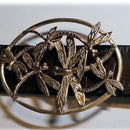 Can be made to fit a 1 1/4 inch wide belt, or 1 1/2 inch wide belt. Measures 2 1/8 inch tall and available in our Rose, Yellow or White Bronze versions. Belts are available in our Leather Section.