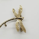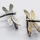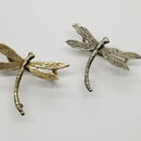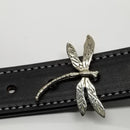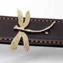 Our large Dragonfly, solo, as a buckle. This one shows off the large Dragonfly alone, rather than our cluster of Dragonflies fancy Buckle. He has spread wings with detail markings and a tapered body with segmented rings. The eyes are very protruded and he is ready for flight. The bar for the belt is hidden under the wing area, and a hook to set the belt is under the body. Very cool piece, I must say!! He is simple and elegant  alone. This piece measures  1  5/8 inches long x  2 inches tall. Fit is for a 1  1/4 inch leather belt. White Bronze or Yellow Bronze. A favorite! Check out our Leather Page for belt options.