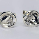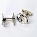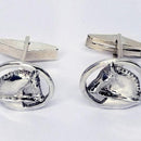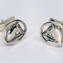 Tempi offers great Men's Cuff Links!! Here is our Dressage Horse on a Circle, a right and left version, witha double bridle, braided mane and arched neck. There is some space, as the horse is "cut out" from the circle and the shirt color will be see, showing off the horse detail and raised relief. These measure 3/4 inch round and are offered in sterling silver. The cuff link has a moveable "torpedo " back to easily fit the shirt opening. A great gift!!