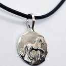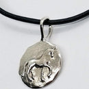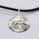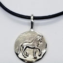 Piaffe Round Pendant Our medium round Piaffe Horse pendant. This measures 3/4 inch round and measures 1 1/8 inch tall overall with bail. Raised relief of a horse performing a piaffe. The original design was a buckle that had an FEI rider critique for position and form. Arrives on a black leather neck cord. Sterling Silver This design has matching earrings in a right and left version as studs, lever backs, and other options. Check our earring listing.